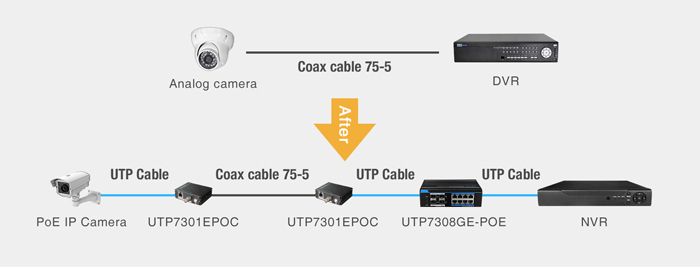 UTP7301EPOC consists of one SV-Unit and one IPC-Unit. It can transfer Ethernet signal of IPC-Unit to carrier signal though coaxial cable or network cable and extend to SV-Unit, then transfer carrier signal to Ethernet signal and transmit power synchronously.